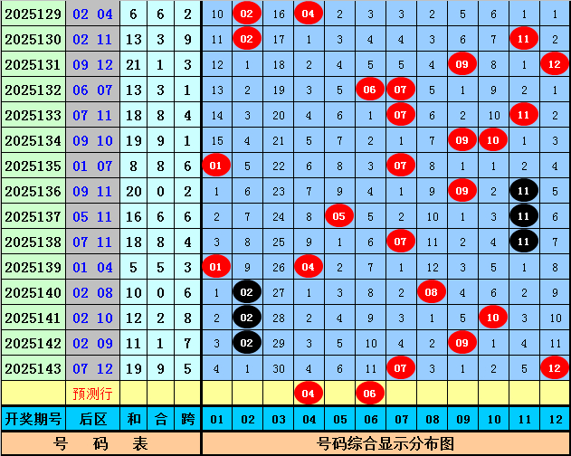后区分析:上期后区为一奇一偶号码07+12,最近10期后区号码奇偶比为12:8,最近50期后区奇偶比为47:53,本期后区关注全偶组合,看好号码04、06。